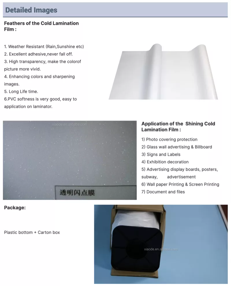 Cold laminated film is made of transparent PVC with pressure sensitive adhesives, and using this layer bind the film to the material being laminated. Cold laminating film is mounted or laminated to graphics by laminator to protect graphics against scratch, stain and moisture.